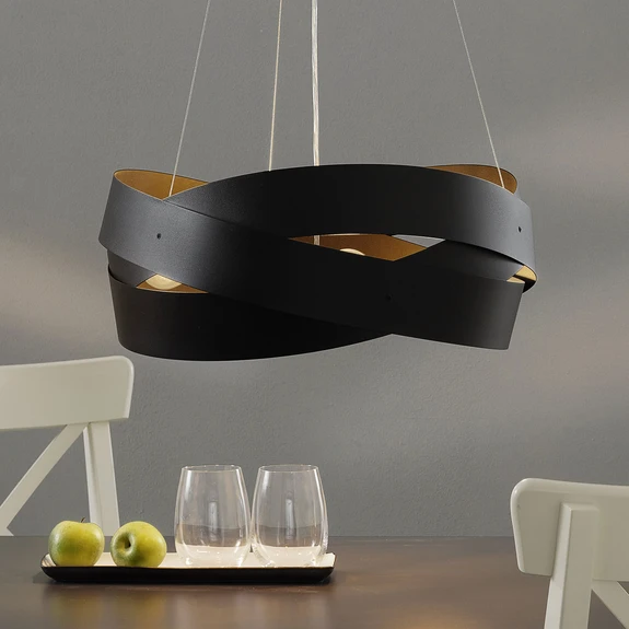 La moderna lampada a sospensione Tornado convince su tutta la linea: a caratterizzarla è il suo paralume di bella forma, composto da tre larghe strisce metalliche. La luce si concentra in alto e in basso ma fuoriesce anche dalle piccole aperture laterali. Il paralume di Tornado è verniciato in colore nero satinato, una finitura tanto moderna quanto raffinata che incornicia alla perfezione ogni tavolo da pranzo. Tuttavia la lampada Tornado può trovare posto in molti altri ambienti, per esempio in salotto, dove costituisce comunque un autentico colpo d'occhio.